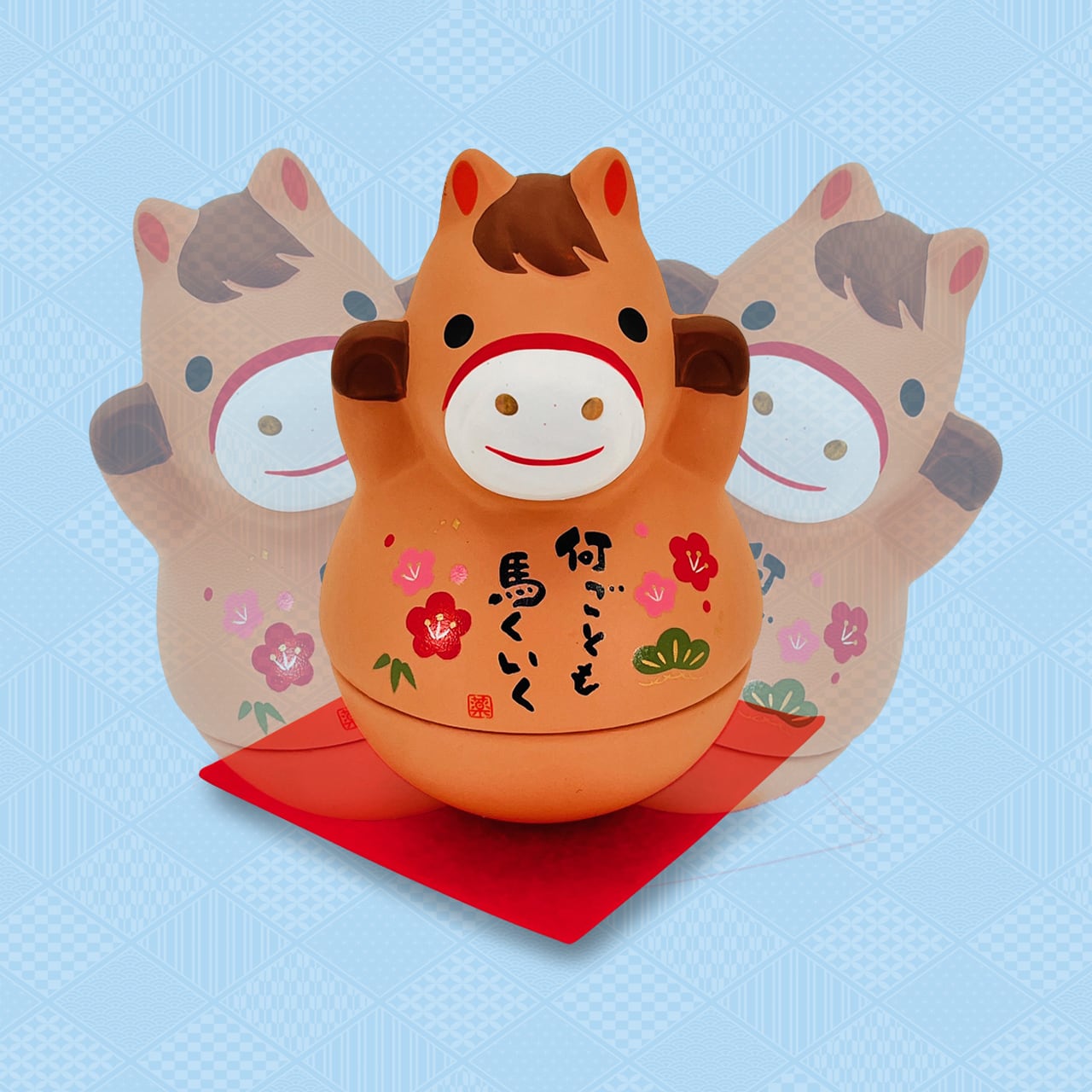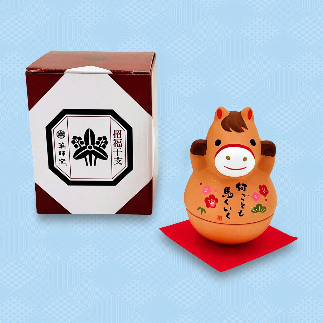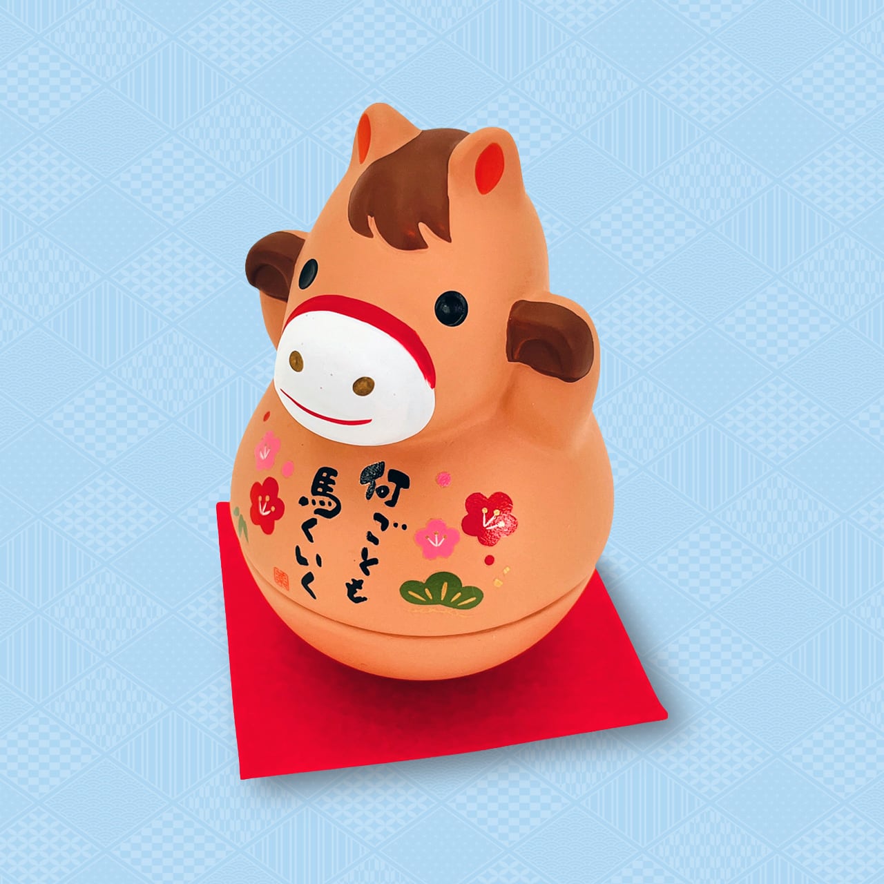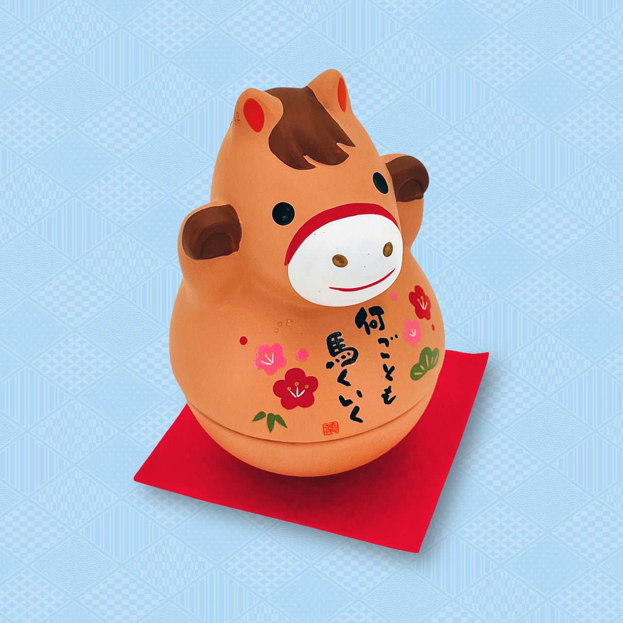 コロンと可愛くて、倒れてもすぐに立ち上がるところから、縁起が良いとされる起き上がり小法師 (おきあがりこぼし) 。2026年の干支にちなんだ「招き馬」の形です。